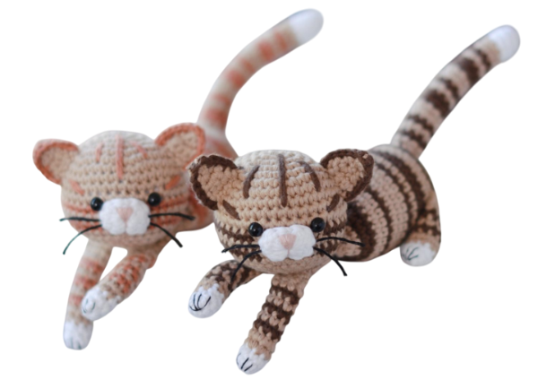 Patrón para tejer Amigurumi Gatitos atigrados Joy y Jolly en crochet.
