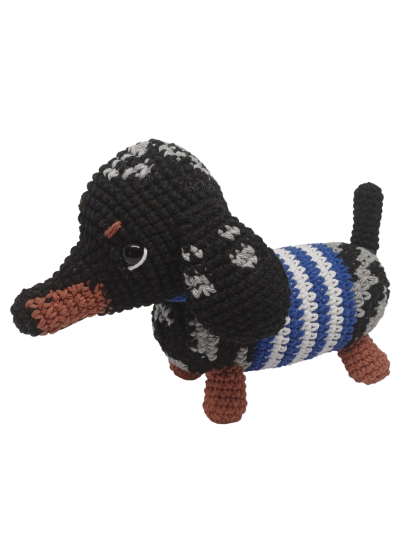 Simpático muñeco de Perrito salchicha mini arlequín amigurumis en crochet.