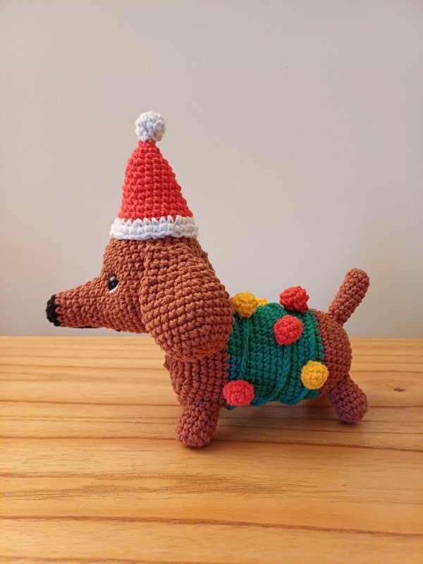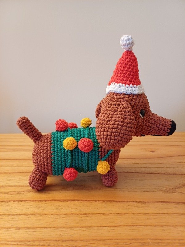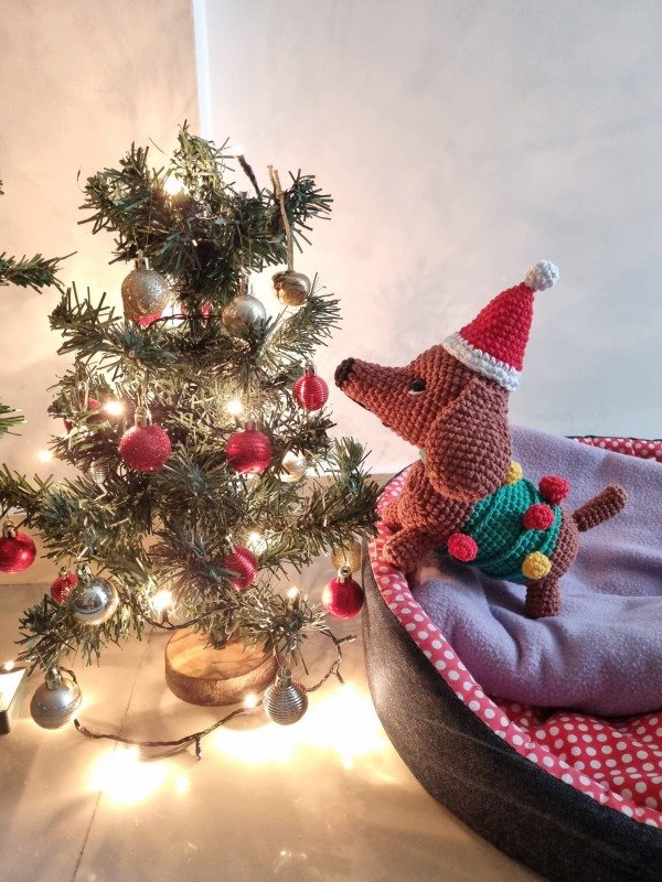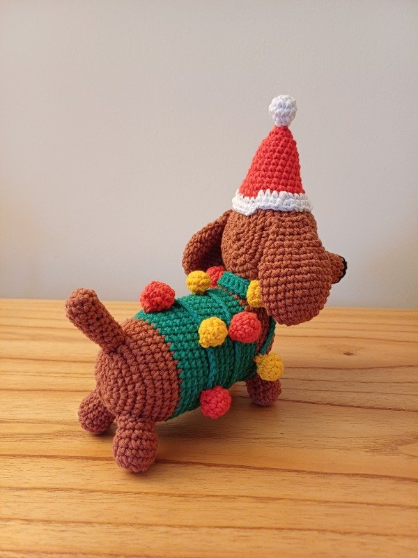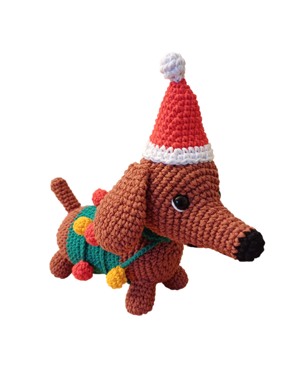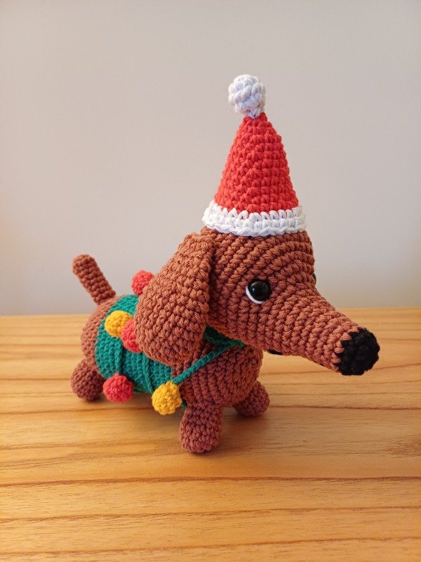 Simpático muñeco de Perrito salchicha mini Navideño, envuelto en luces de arbolito, con gorro y collar amigurumis en crochet.