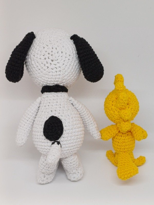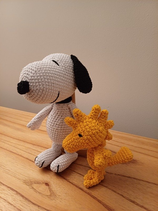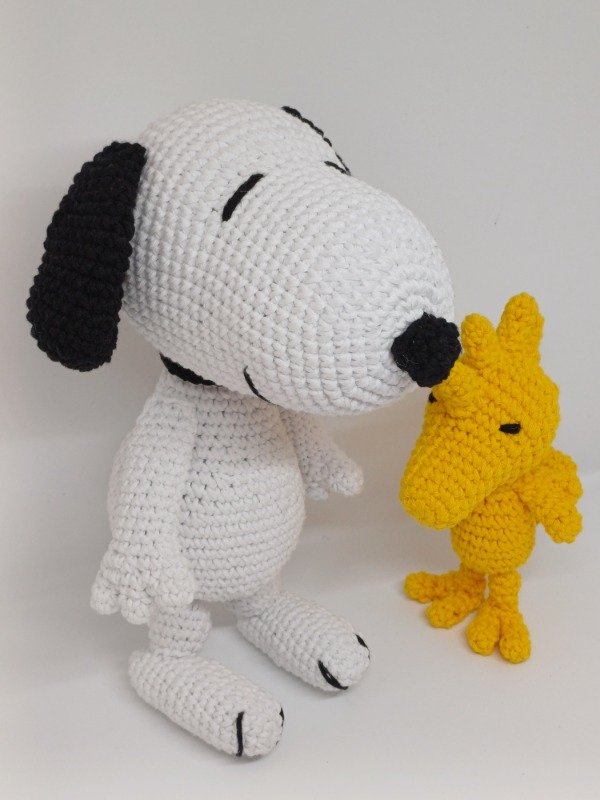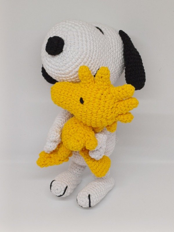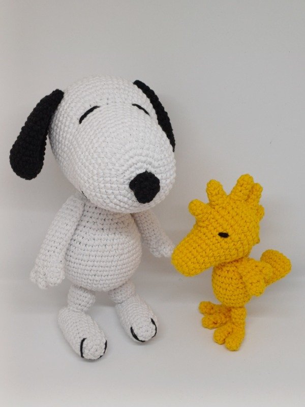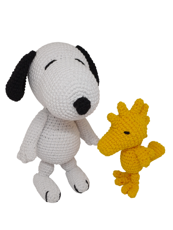 Muñeco Snoopy con su amigo Emilio (Woodstock) tejido al crochet con hilo de algodón y relleno con vellón siliconado.