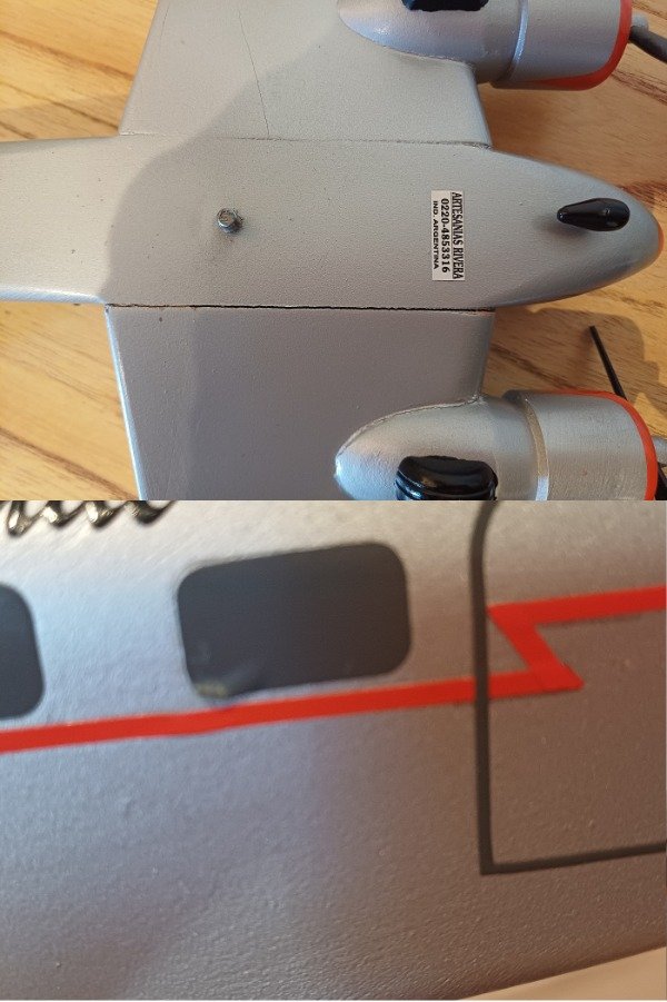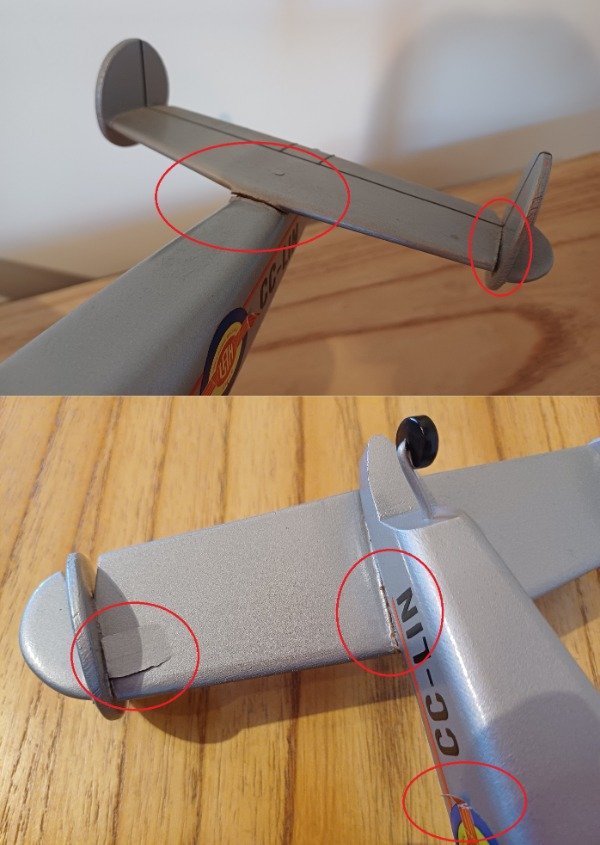 Tiene un pequeño detalle en la cola, en la unión, y debajo de la cola, y un poco despegada una etiqueta, como se ve resaltado en las fotos